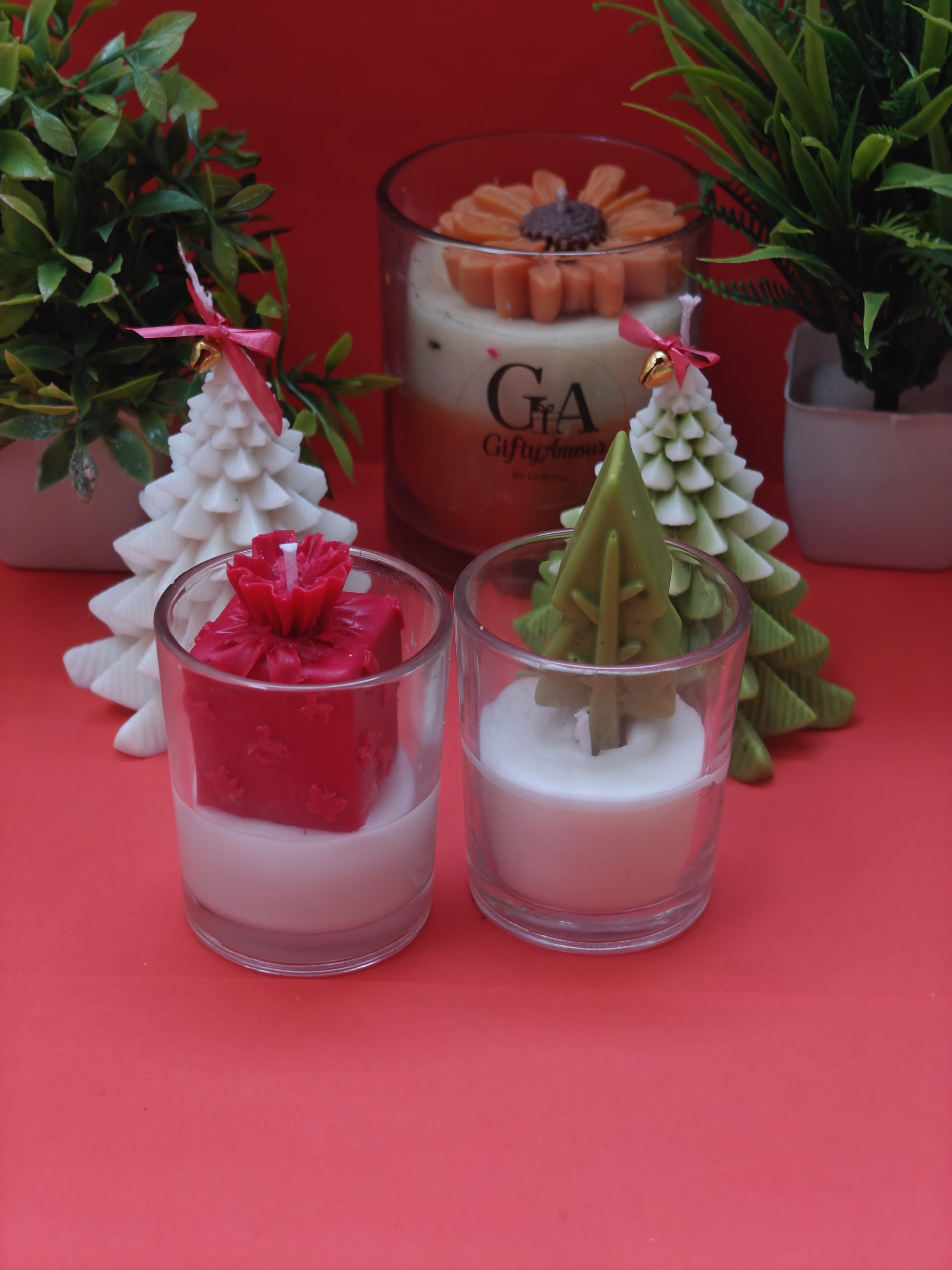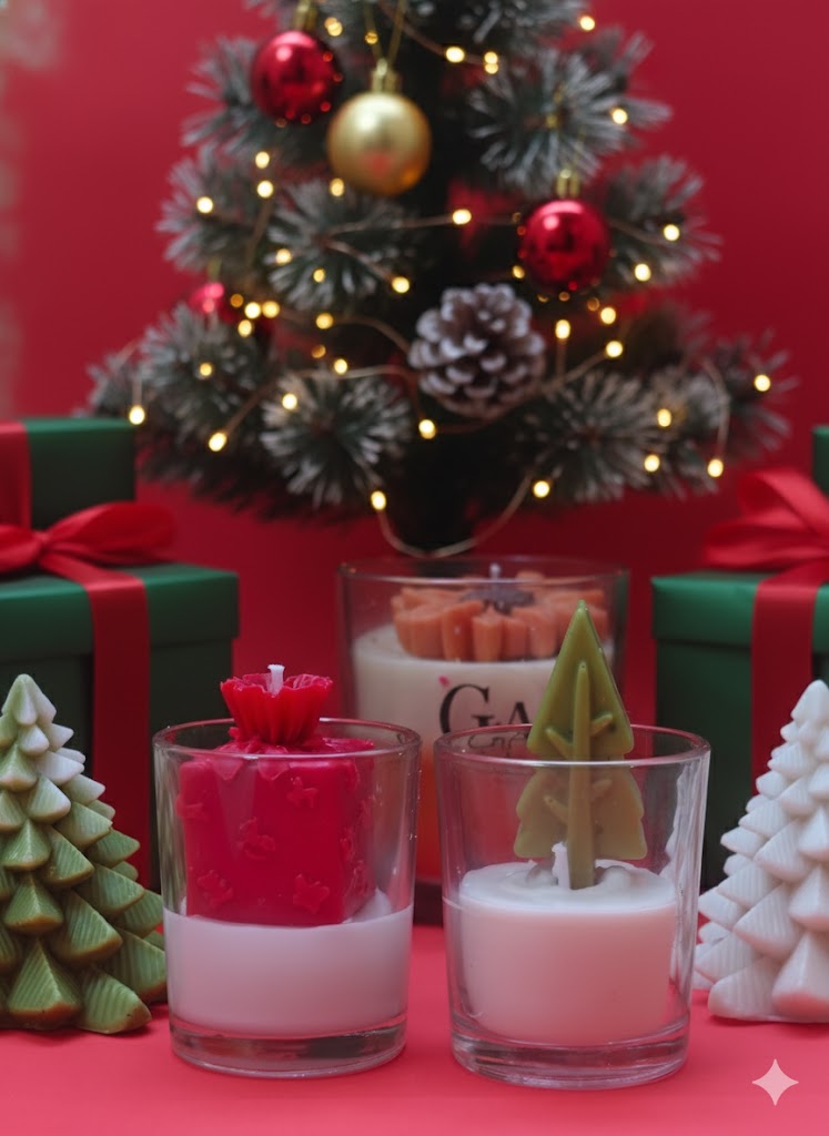 - The Pine Tree Candle (Green): A serene and stylish candle topped with a deep green layer molded into a miniature Christmas tree, set above a clean white base. It captures the classic essence of the season.